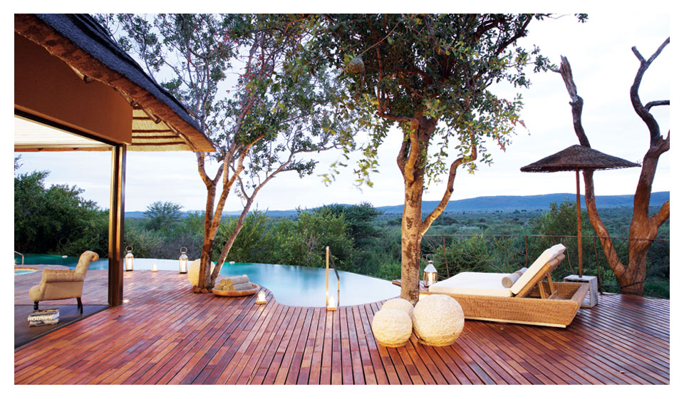 The spacious two-bedroom Molelo Presidential Suite combines elegance with modern African design elements, and offers a magnificent elevated view across the African landscape. Retractable floor-to-ceiling glass doors make the most of the view and give way to a spacious wooden deck, infinity pool, hot spa bath and alfresco dining area.